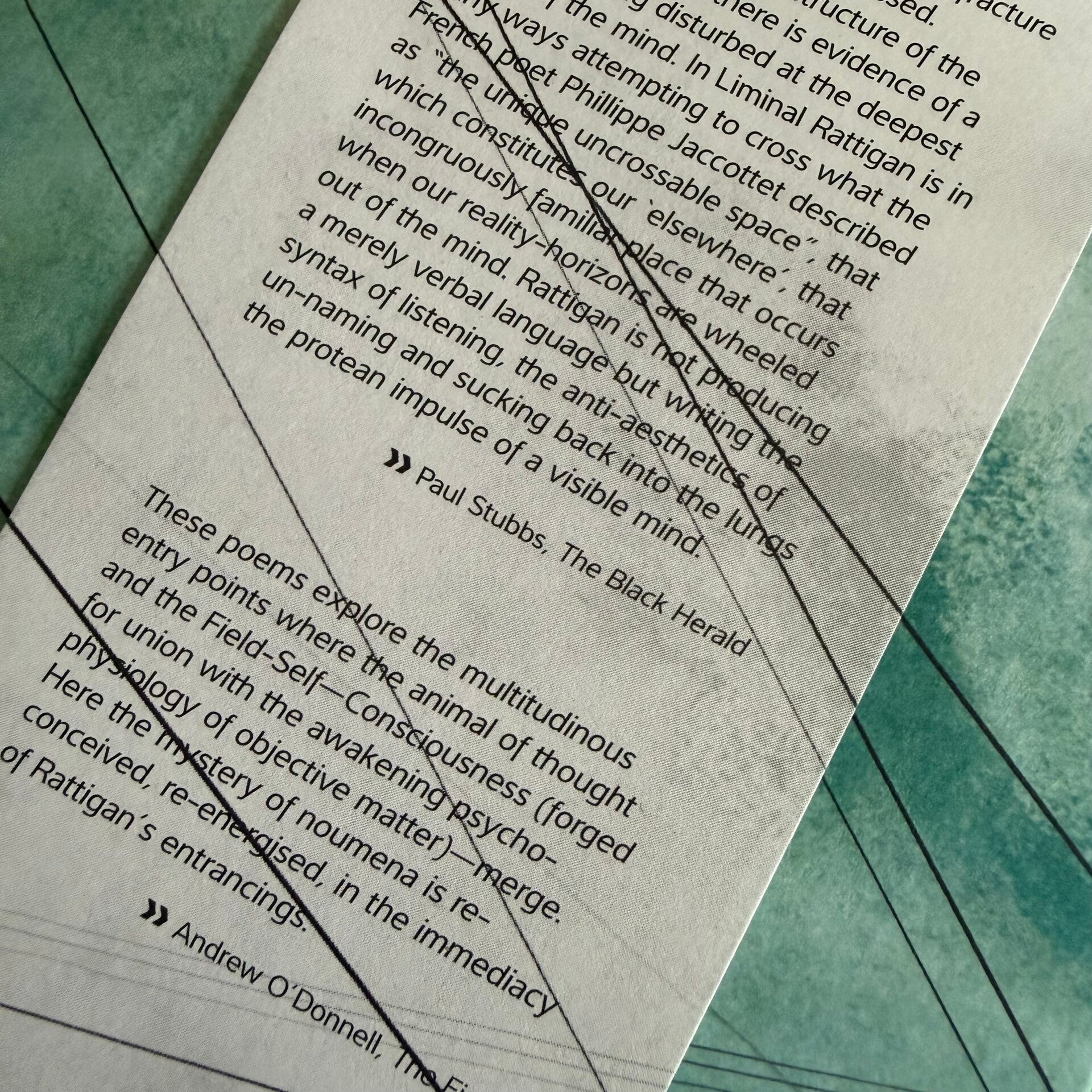 ¶ Michael Lee Rattigan is seeking to pinpoint that ‘other’ voice, for everything that he writes it seems exists only to advance silence, or at least our unmediated access to it—while consciousness is no more than a fine vessel of flesh and blood stretched over the diaphanous musculature of each word; for this poet does not produce a merely verbal language, no, rather he is writing the syntax of listening, the anti-aesthetics of un-naming and sucking back into the lungs the protean impulse of a visible mind. — Paul Stubbs, The Black Herald